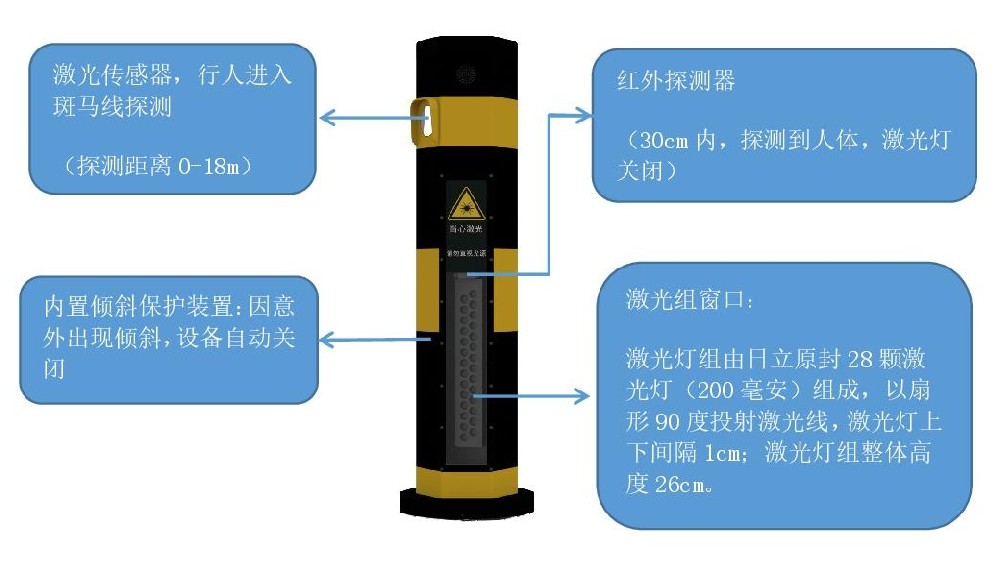 在與廠家技術人員溝通得知,該機采用激光+紅外的雙感知方案,激光燈組由日立原封28顆激光燈(200毫安)組成,以扇形90度投射激光線,激光燈上下間隔1CM,激光燈組整體高度為26CM,激光不會直射人眼。行人感應器有效探測范圍20米。還具有傾斜保護和行人近距離保護功能,當激光樁意外傾斜或有行人靠近激光燈范圍30cm以內時,激光燈關閉,起到一個很好的保護行人的作用。